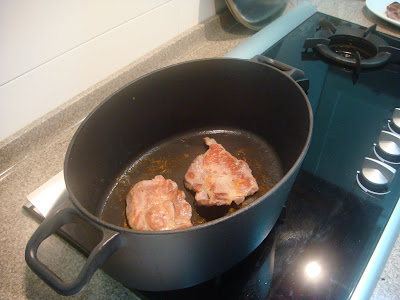 豬排放在這個鐵鍋繼續煎(抱歉我中間似乎忽略什麼步驟了)這個鐵鍋很重,但是很漂亮。一買回來媽媽還不太知道要怎麼使用。