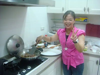 就是傳說中的陳阿姨喔!她正在煎豬排。這是不鏽鋼鍋,導熱很快,很適合急性子的媽媽。