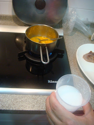 製作豬排的醬汁,用金桔加...呃...就不知道了,這個白白的是準備加進去的太白粉混水。