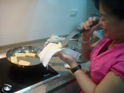 阿姨用銅鍋煎豆腐,豆腐打開時先用衛生紙把水吸乾,免得水在鍋子裡會亂噴。另外,用鐵板也更好切豆腐。